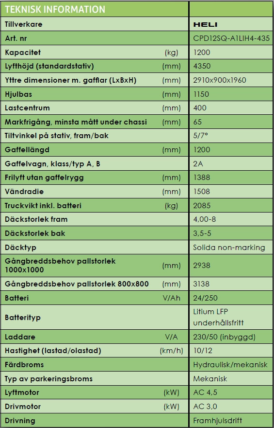 Heli CPD12SQ-A1LIH4-435 kombinerar kompakt design, hög prestanda och modern litiumteknik. Med en lyftkapacitet på 1,2 ton och smarta funktioner är den byggd för effektivitet i trånga utrymmen – perfekt för lager, logistik och detaljhandel där driftsäkerhet och kostnadseffektivitet är avgörande.